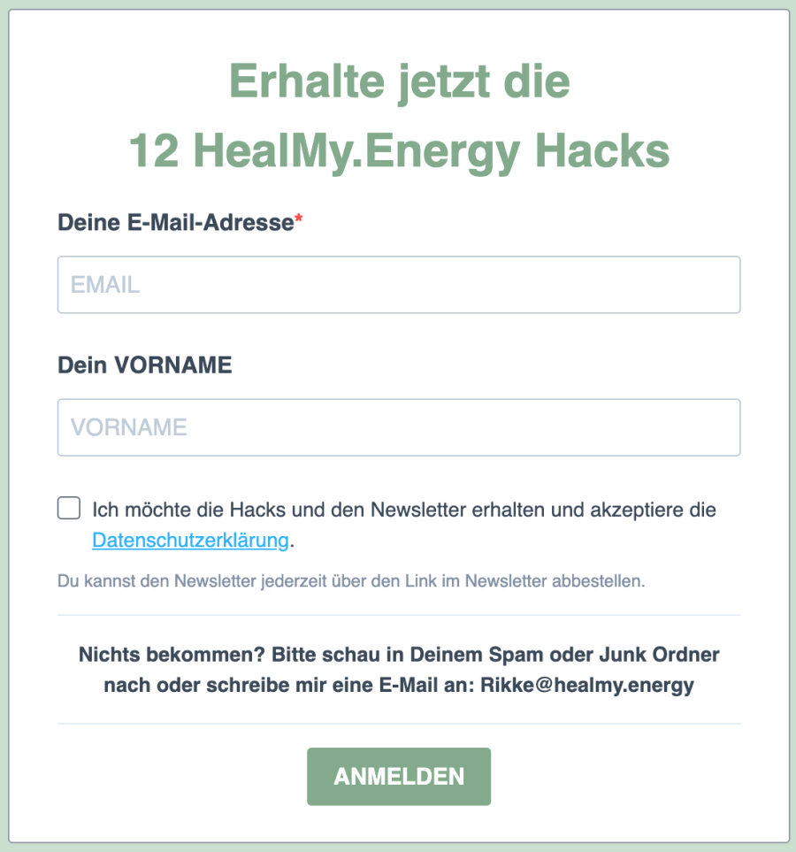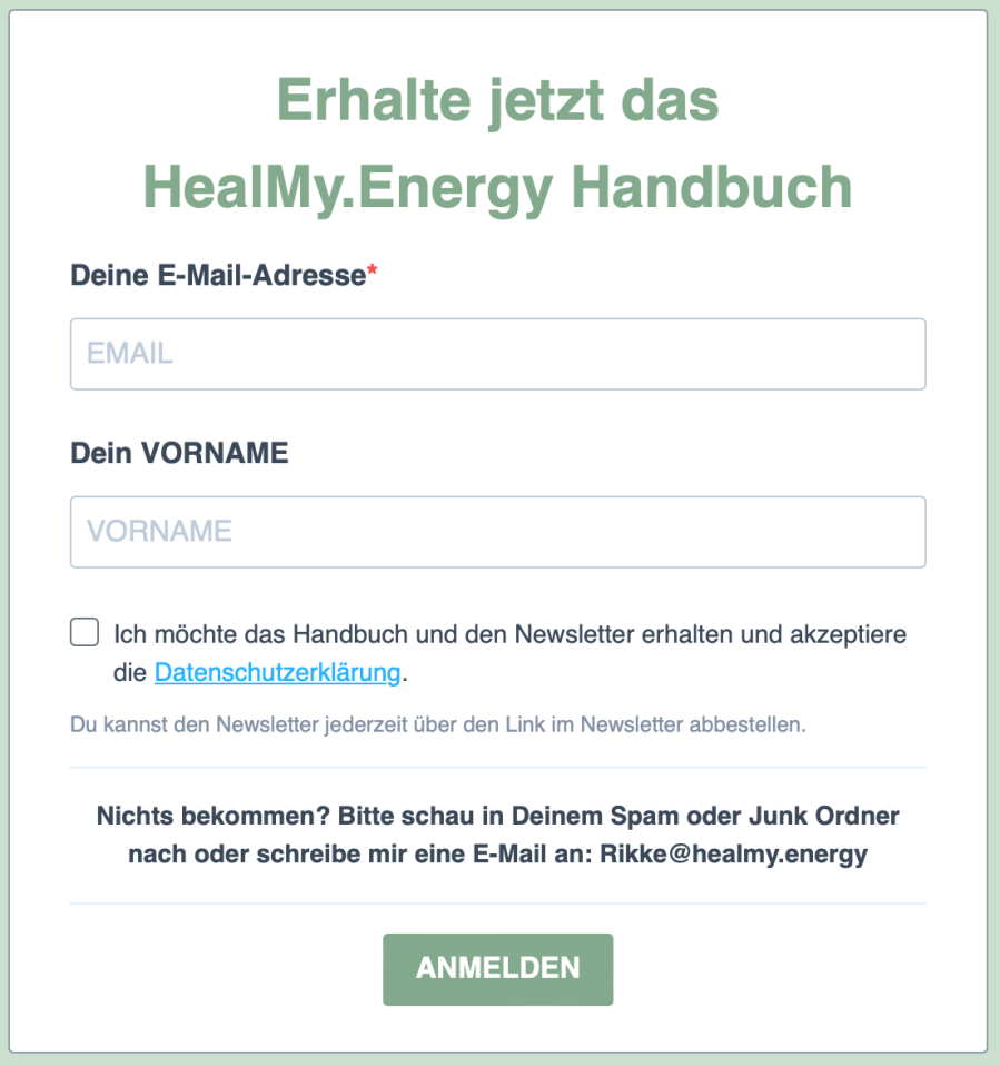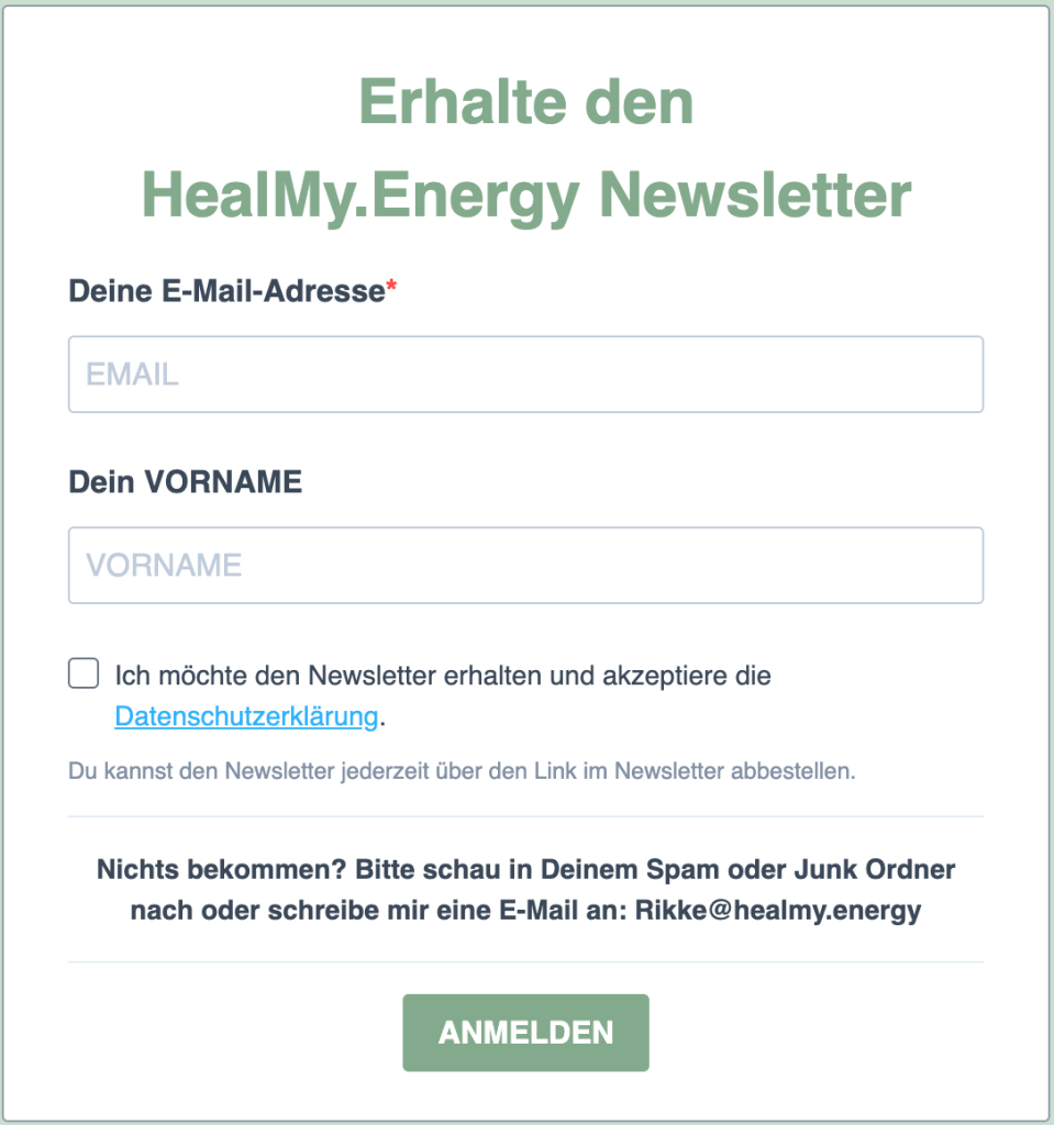 Erhalte regelmäßig Neuigkeiten rund um Heal My Energy, Neue Angebote und Aktionen aus den Bereichen Energieheilung & Naturcoaching, Impulse, Denkanstöße und praktische Tipps für mehr Leichtigkeit und Entspannung im Leben.